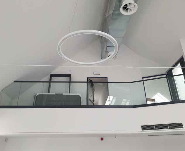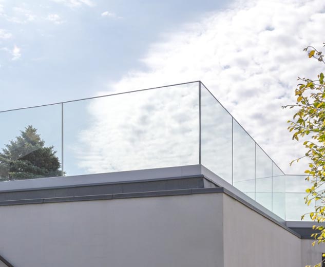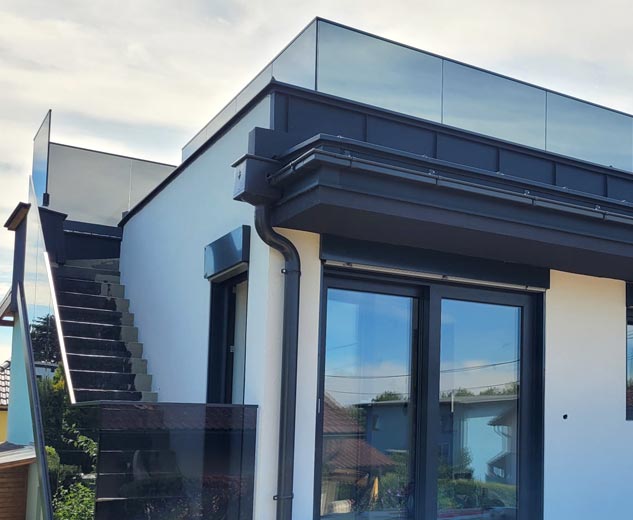 Balustrada szklana sprawdzi się tu równie świetnie co na balkonie czy tarasie. Możliwość modyfikacji kolorystki profili i szkła pozwoli jeszcze lepiej wkomponować balustradę w bryłę budynku.